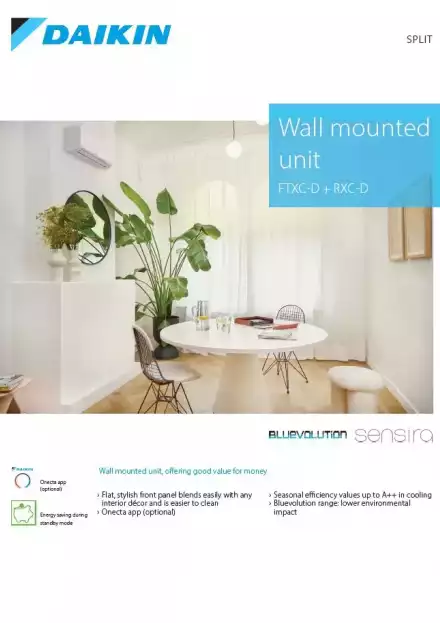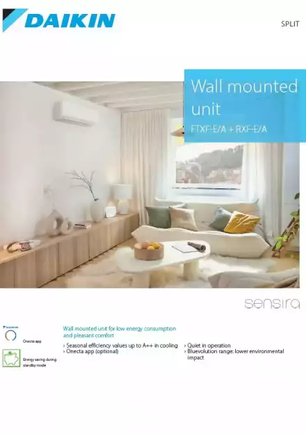 Sensira FTXF-E Inverter Air Conditioning Systems: Designed for value and superb efficiency. The decorative panel is in glossy white, makes it easy to fit the indoor unit into any room and guarantees high-quality cooling and heating at an attractive price. Reduced CO2 impact of the unit and reduced current consumption 1:6. Ability to control functions via the Onecta mobile application from the new WiFi adapter BRC069C47. Economy mode, Comfort mode, 5-stage fan for precise airflow, automatic vertical rotation of the louvers and Quiet mode of the indoor unit up to 10dBA. The logo will be updated on the internals from the 20,25,35 and 42 class model.