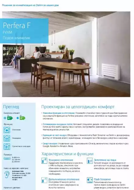 Perfera подов FVXM-A9: най-подходящия рентабилен моносплит вече и с възможност за ефективна климатизация до 5 стаи само към 1 външно тяло. Проектиран за целогодишен комфорт. С уникални функции за отопление, почивате спокойно в студените дни благодарение на функциите Heat boost, Floor warming и Heat plus. Характерният дизайн на подов климатик Perfera позволява въздушният поток да oтоплява едновремено както надолу в краката, така и нагоре към тавана, осигурявайки равномерно разпределение на температурата до всеки ъгъл в стая. Оборудван с характерната технология Flash Streamer на Daikin и дезодориращ филтър от титаниев апатит, гарантиращ, че вашият въздух е чист от вируси, алергени и миризми. Интегриран във вътрешното тяло WiFi адаптер за приложението Daikin Onecta, гласово управление чрез Google Assistant и Amazon Alexa.