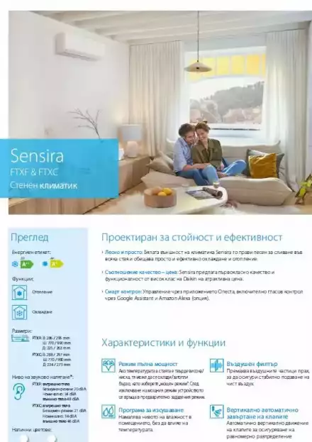 Климатици за дома и работното място от серия Sensira FTXC-D: вътрешното и външното тяло са с нов дизайн, деликатно извити ръбове и накланящ се напред преден панел, което създава по-тънко и по-минималистично впечатление. FTXC-D e eлегантно и достъпно бюджетно решение за безшумно климатизиране. Висока енергийна ефективност SEER 6.89, A++, намалено въздействие върху околната среда с до 68% и намалени потребление на електроенергия при мовишена мощност с до 14%. Двуетапна филтрация, тристепенно регулиране на вентилатора, автоматично вертикално въртене на жалузите, нощен режим на работа за спокоен сън, мобилно приложение за отдалечен контрол на системата.